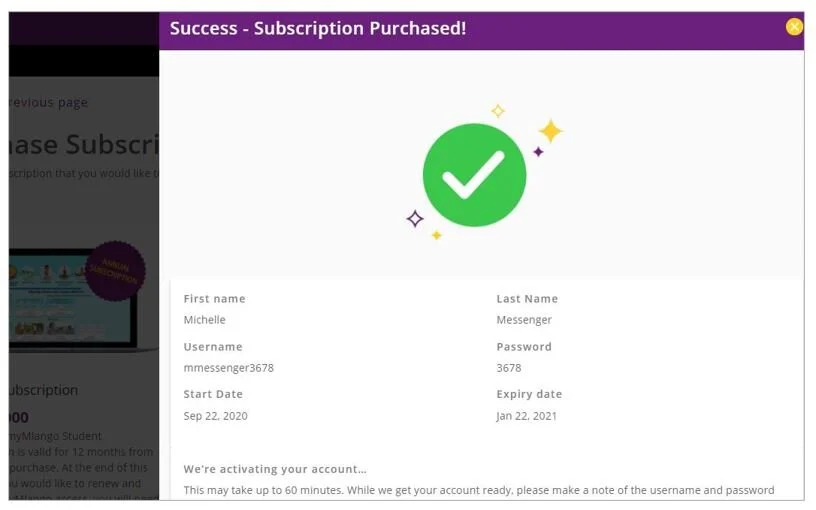 Please note that it may take up to 60 minutes to activate your account. After 60 minutes has passed, please go to mymlango.com and click on the Login link at the top of the screen to access the Learning Portal.