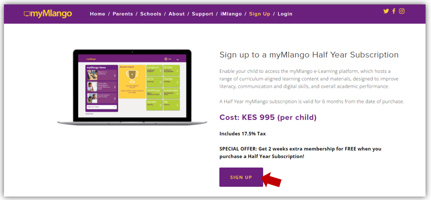1 Go to the myMlango website and click Sign Up along the top navigation bar and then choose the Subscription you would like to purchase. This will either be an Annual Subscription, Half Year Subscription, or a Term Subscription.